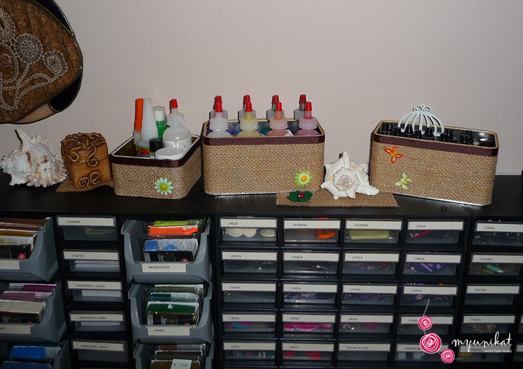 V Hofer-ju sem si kupila te super predalčke, na katere sem dodala napise in tako vzpostavila red. Veliko stvari pa imam pospravljenih tudi v omarah, saj se mi je nabralo že ogromno ustvarjalnih pripomočkov.