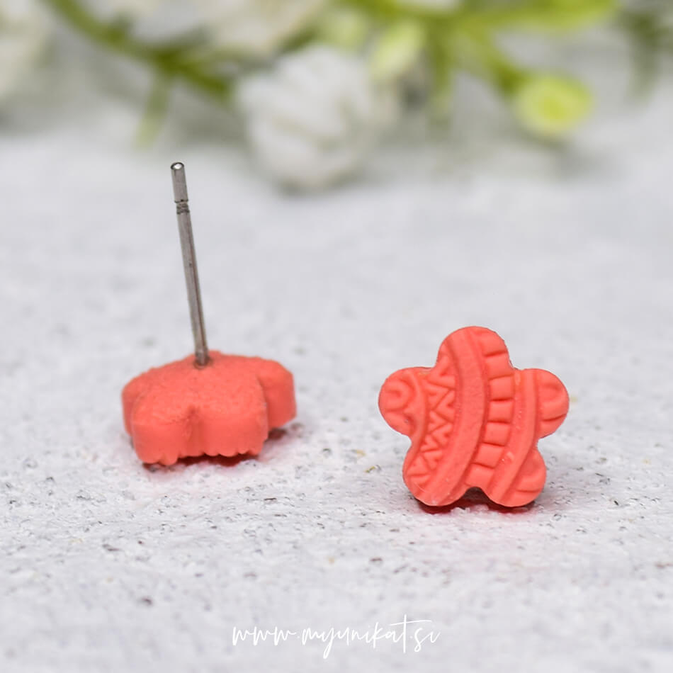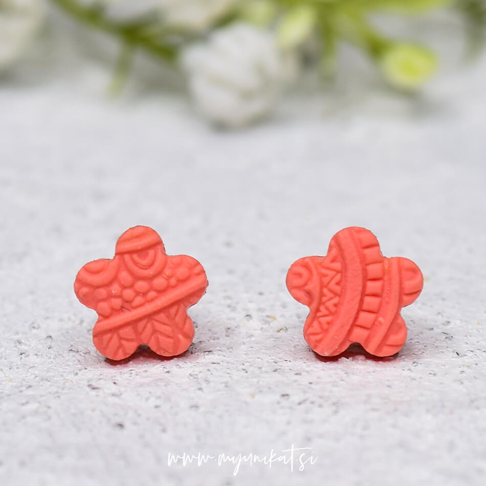 – uhančki so ročno izdelani iz FIMO mase // imajo obliko rožice, spredaj imajo 3d odtis in zadaj mat efekt/teksturo