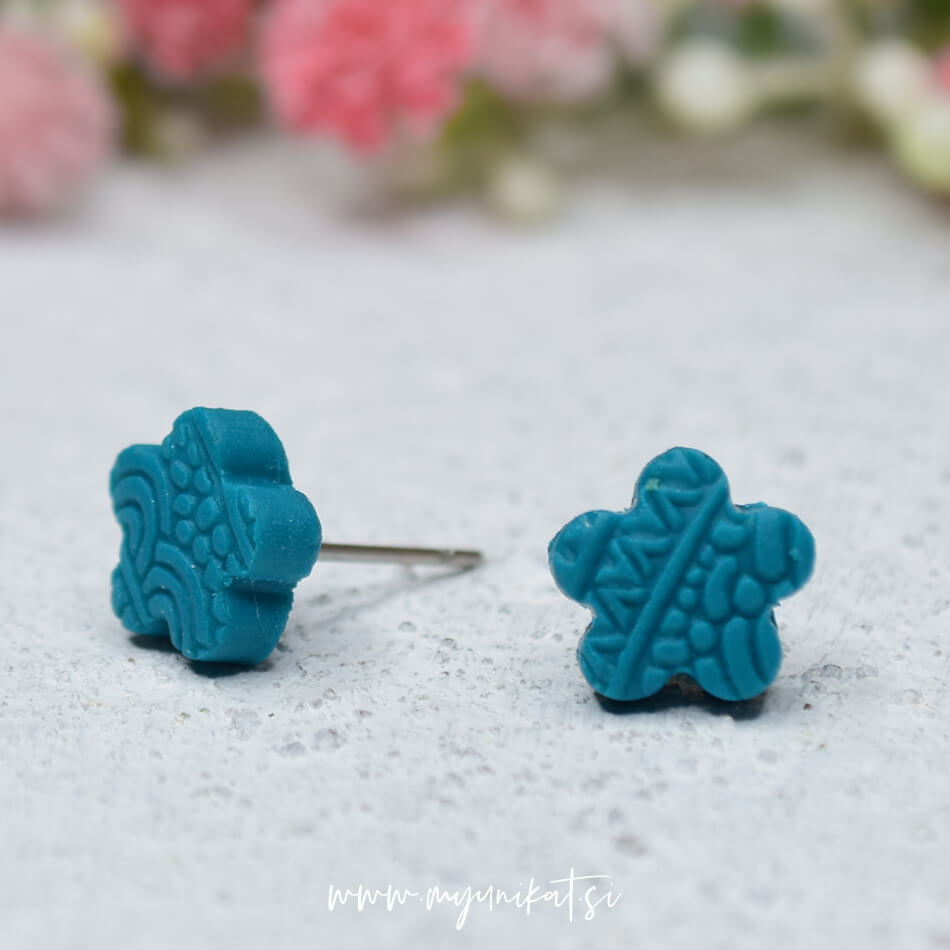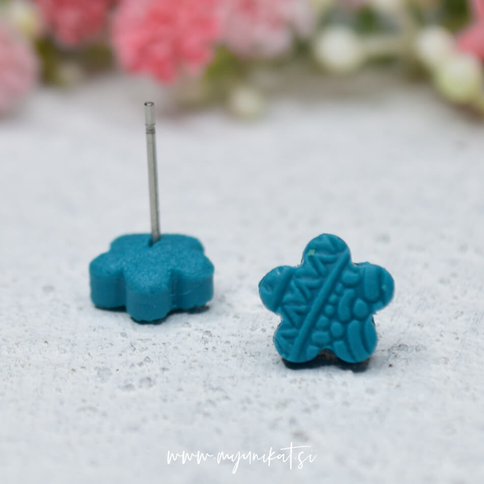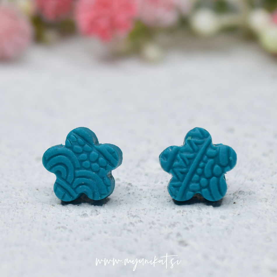 MINI unikatni uhani – rožica – v modro zeleni barvi. Namenjeni so TEBI, ki imaš rada mini in kjut uhančke, da jih lahko nosiš prav vsak dan.