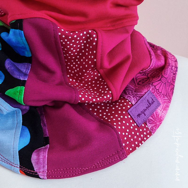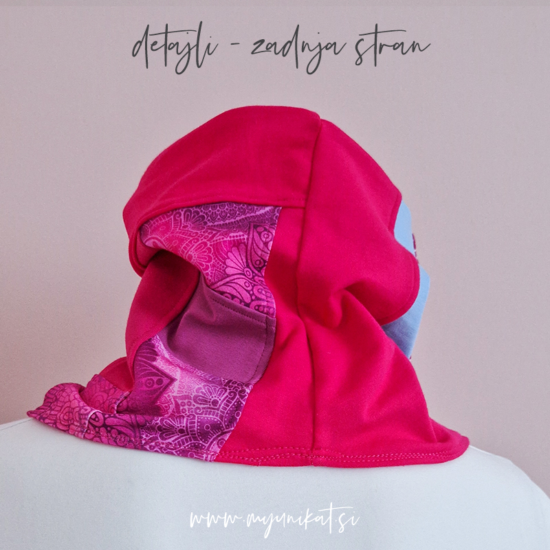 enotna velikost – širina (merjen je obseg najožjega, a malenkost raztegljivega dela) cca 51 cm, nato se šal razširi (tega nosim tudi sama – obseg moje glave 55 cm, obseg vratu 33 cm).