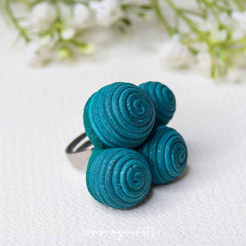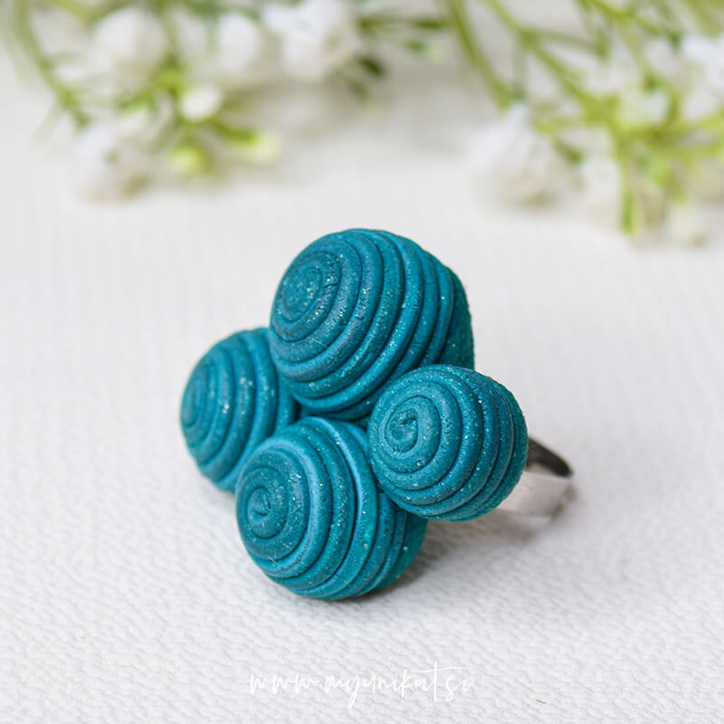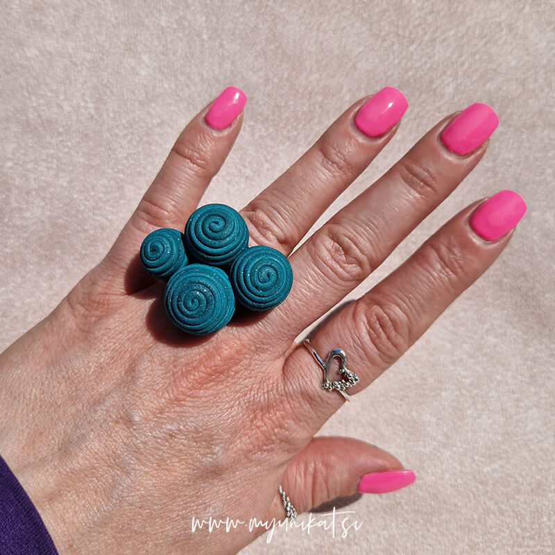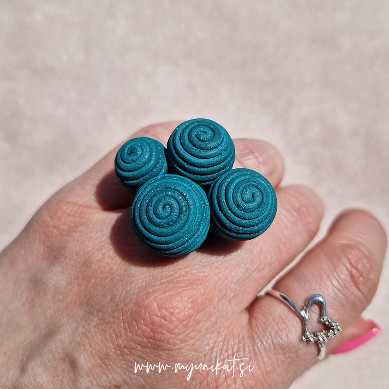 Unikatni prstan s 3d bunkami v petrol barvi je namenjen TEBI, ki imaš rada velike, unikatne in ročno izdelane modne dodatke. Ker je drugačen in edinstven bo vedno znova dodal še zadnjo piko na i tvojemu stylingu.