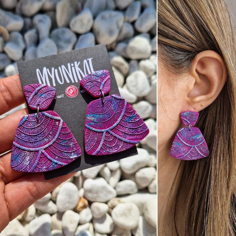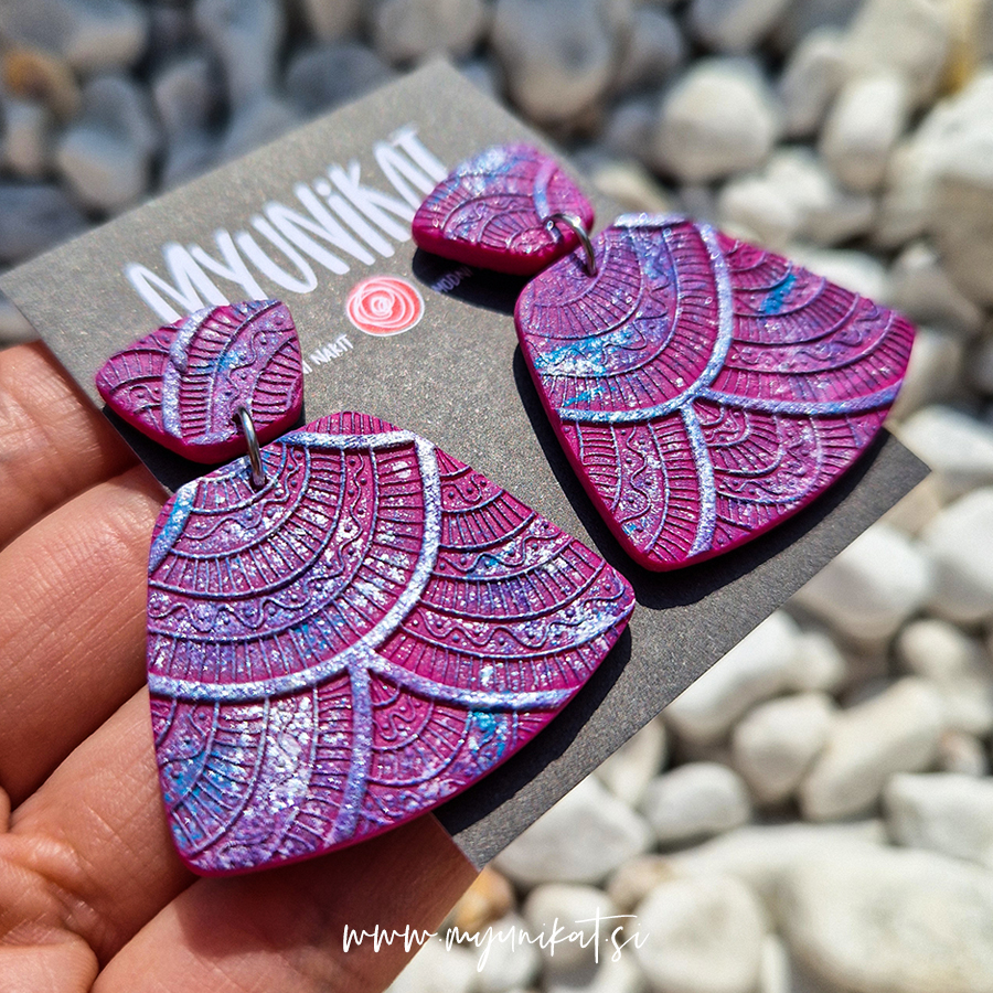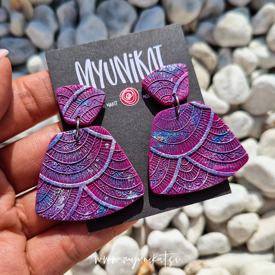 – ročno so izdelani iz FIMO mase. Imajo različno teksturo in so abstraktno potiskani. Vsak par je na voljo samo en, saj ponovitev enakega ni možna.
