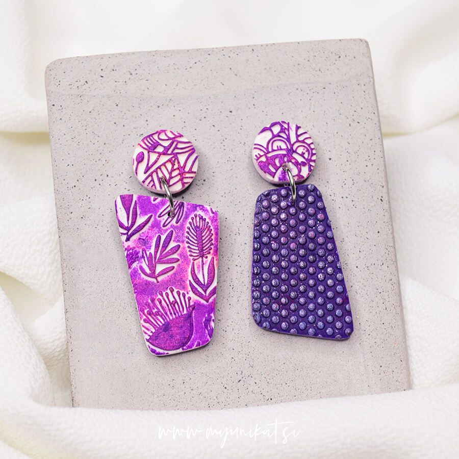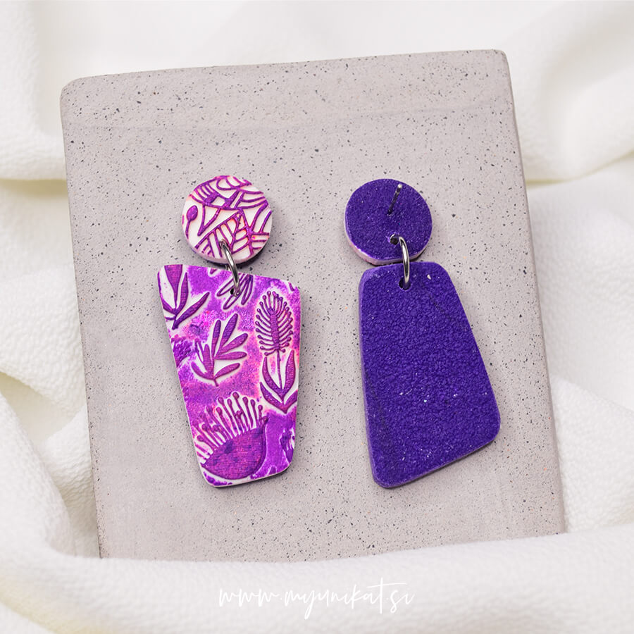 – ročno so izdelani iz FIMO mase. Imajo različno teksturo in so abstraktno potiskani. Vsak par je na voljo samo en, saj ponovitev enakega ni možna.