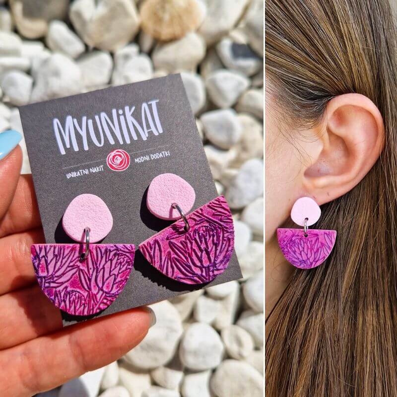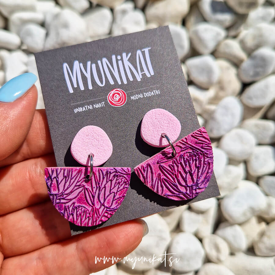 – ročno so izdelani iz FIMO mase. Imajo različno teksturo in so abstraktno potiskani. Vsak par je na voljo samo en, saj ponovitev enakega ni možna.