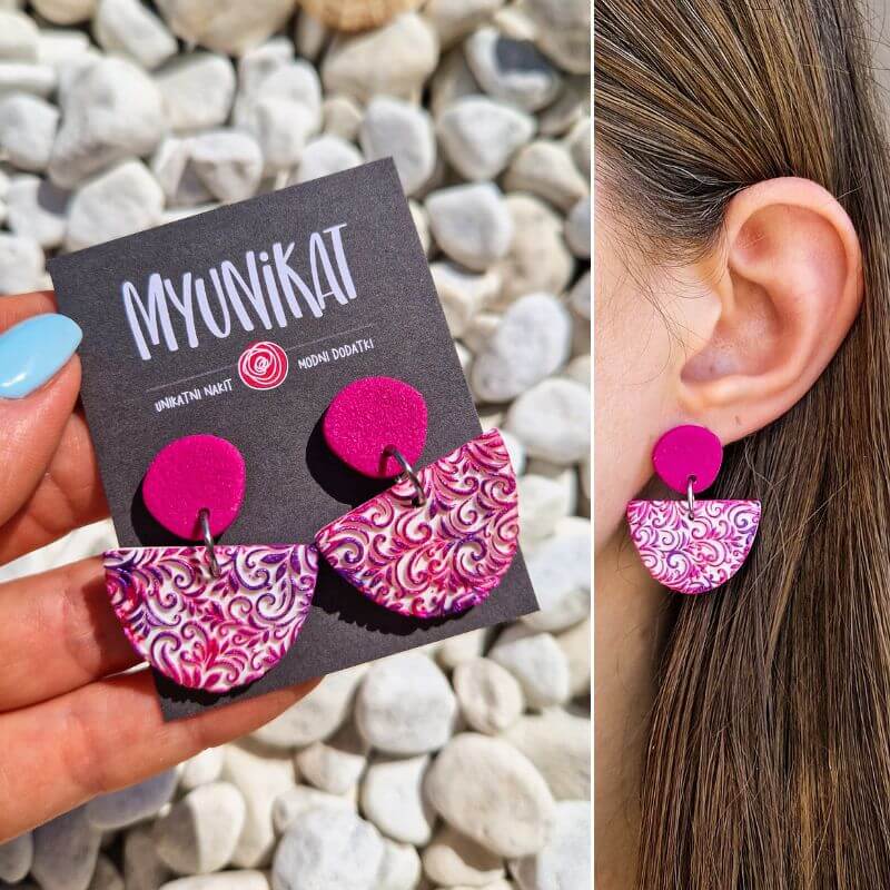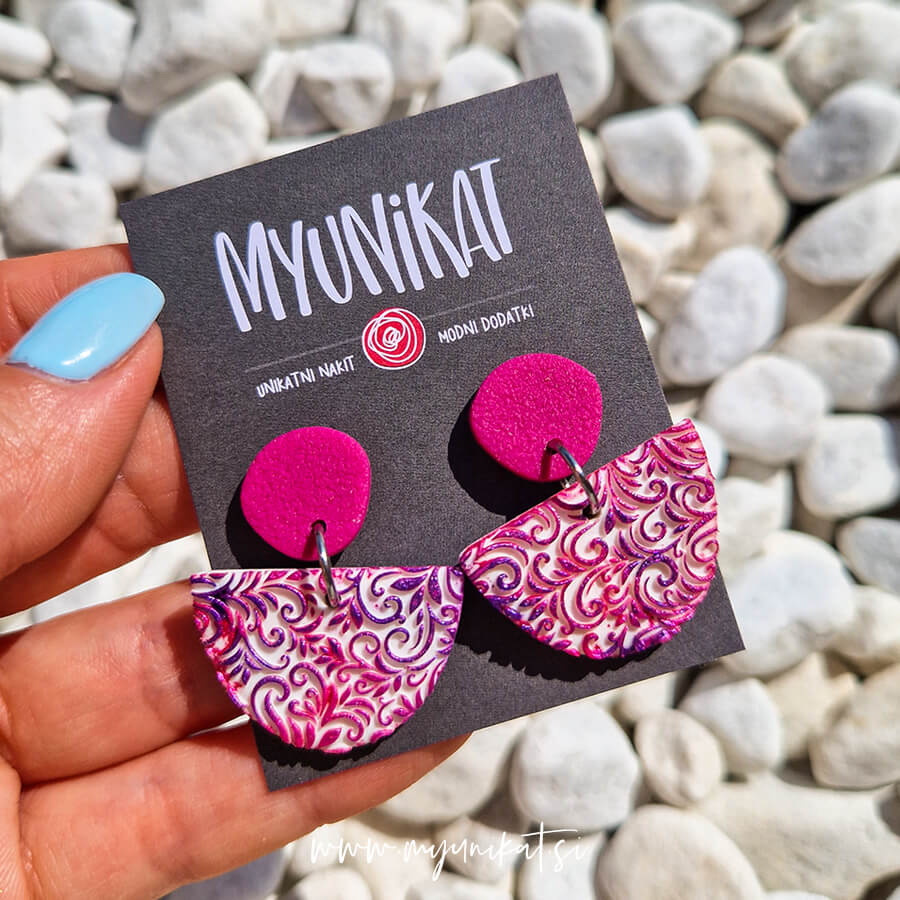 – ročno so izdelani iz FIMO mase. Imajo različno teksturo in so abstraktno potiskani. Vsak par je na voljo samo en, saj ponovitev enakega ni možna.